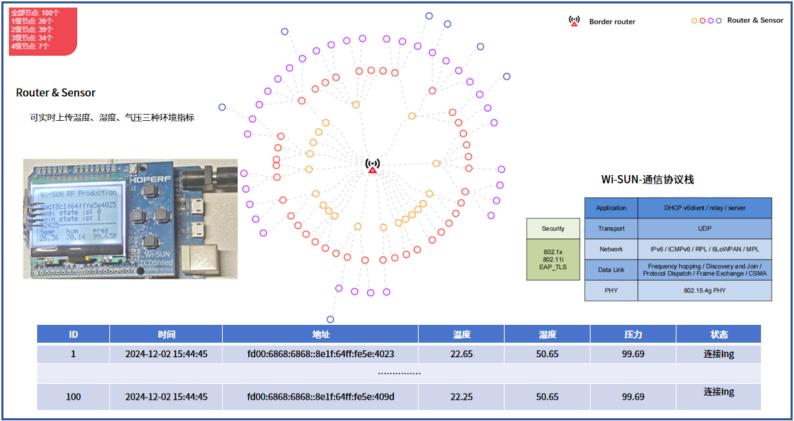 如下图所示,为持续提升Wi-SUN产品性能,今年会微在实地部署了一个具有一定规模的Wi-SUN(FAN)网络,以实现对其通信性能的有效把控。现阶段,该网络已充分验证了上百个Router Node的互联互通,可对Leaf Node的温度、湿度与气压数据进行实时采集,并通过Border Router网关协议将这些环境数据实时上传至后台无线组网数据平台或云端控制系统中。