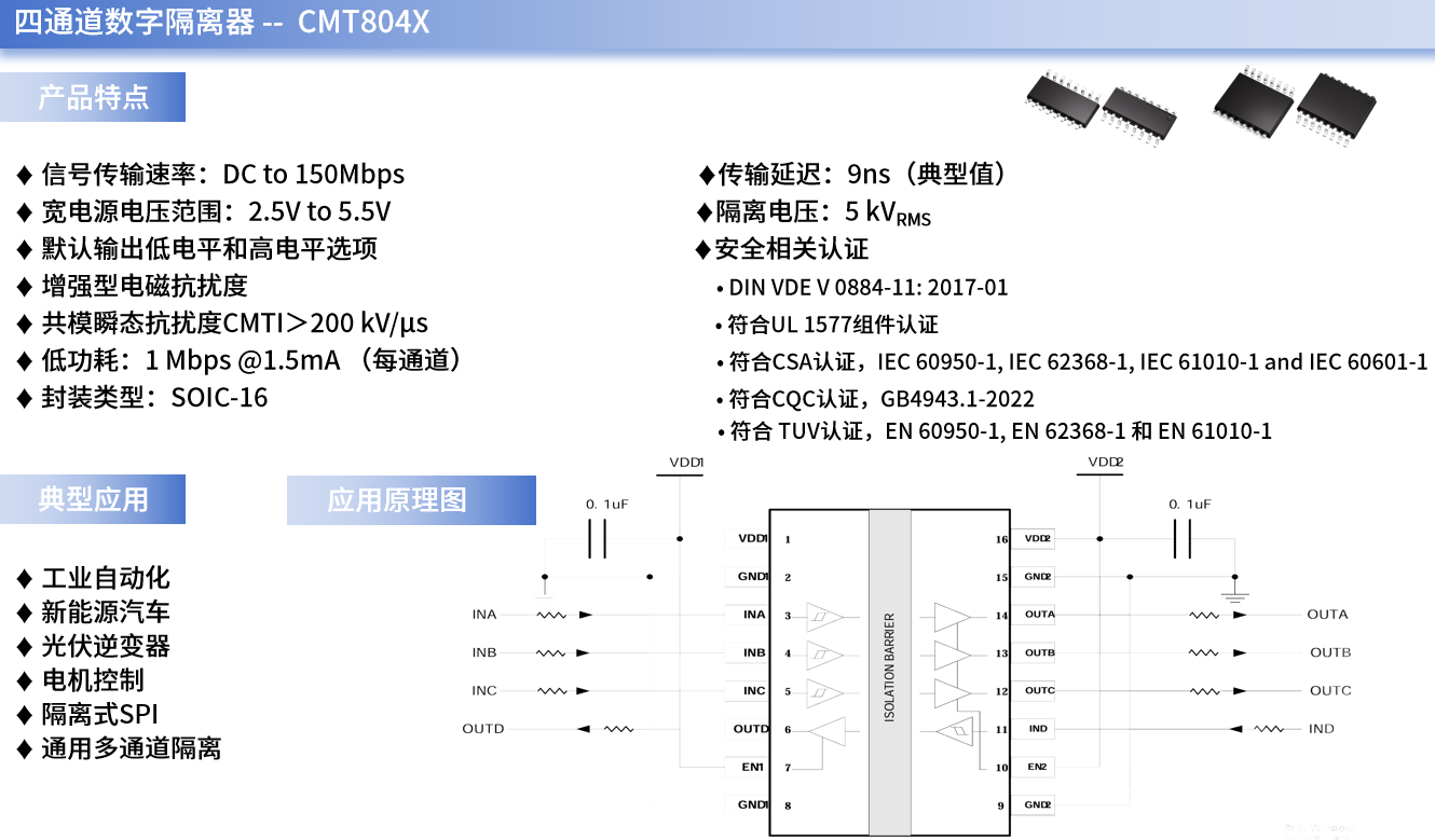 CMT804X是一系列可用于SPI串口通信中的高速四通道数字隔离器。它采用创新性芯片设计和布局,显著增强了器件电磁兼容性,可满足系统级 ESD、EFT、浪涌和辐射方面的合规要求,同时支持高达5 kVrms隔离电压,并具有多达四路正向通道和两路反向通道,可以较低的功耗实现高电磁抗扰度和低辐射。