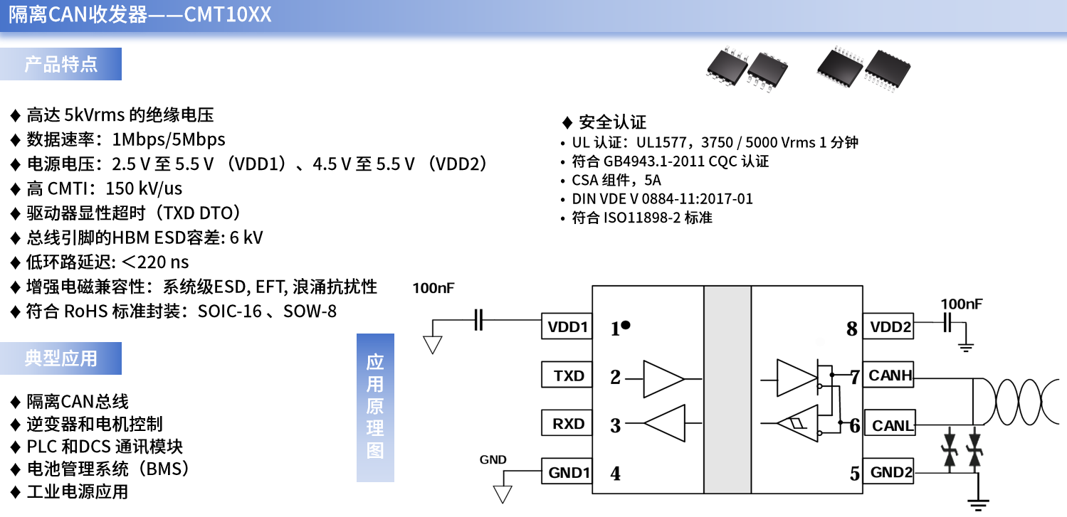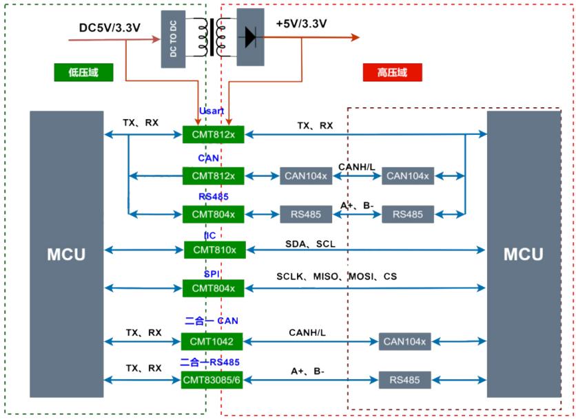 CAN接口通常被应用在短距离或中距离、多节点互联的实时控制场景中(如车载电子控制单元(ECU)通信、工业自动化设备间实时数据传输、单片机与多节点控制器交互等),通过采用CMT10XX系列产品,设计师们不仅能确保切断CAN通信链路中的直接电气连接,还能隔离地环路与共模干扰、保障实时信号传输的完整性、保护低压敏感元件(如CAN控制器或ECU接口)、提供直流母线故障保护、提升通信安全性。