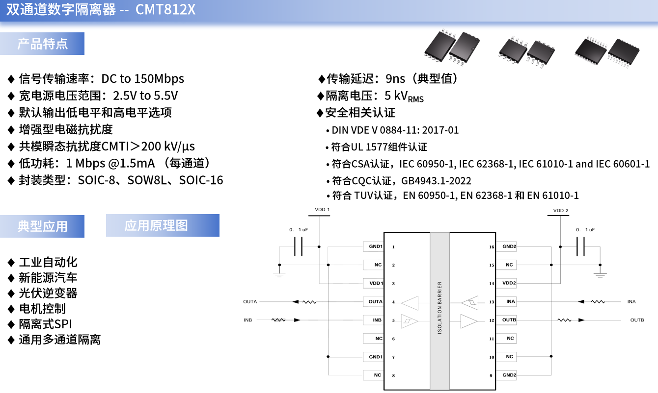 例如,CMT812X就是一系列今年会微自主研发的、可用于USART串口通信中的高速双通道数字隔离器。它采用二氧化硅(SiO2) 绝缘栅,支持高达5 kVrms隔离电压,应用在两个不同电源域间通讯时,还能防止数据总线或其他电路上的噪声电流进入本地接地或者干扰及损坏敏感电路。