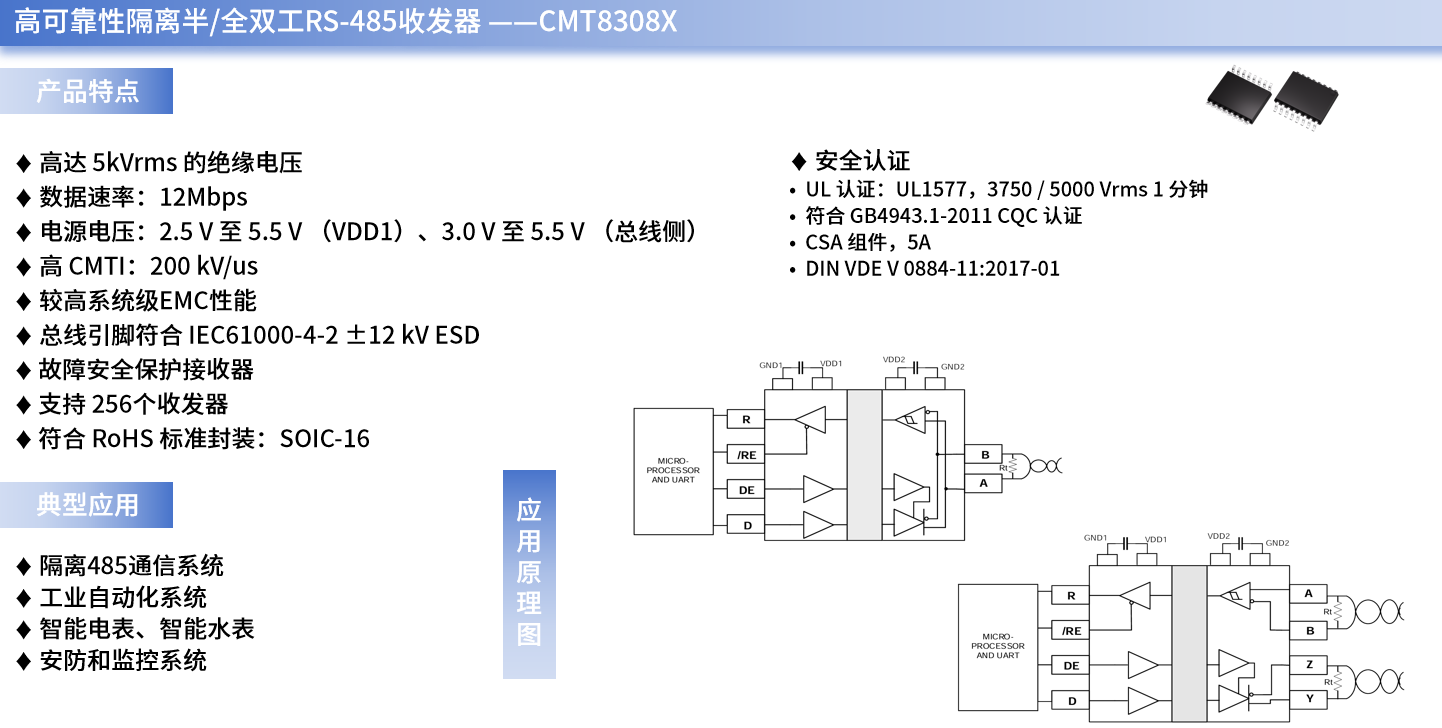 CMT8308X是一系列专用于RS-485串口通信的高可靠性隔离半/全双工RS-485收发器。它总线侧的总线引脚对地拥有±12kV 的系统级ESD保护,支持5kVrms绝缘耐压,具有故障安全保护功能,当接收器输入断开或短路时能确保接收器输出逻辑高;同时,它还支持高达12Mbps的数据速率,具有1/8单位负载的接收器输入阻抗,允许总线上最多连接256个收发器,可以减少总线端的电磁干扰。