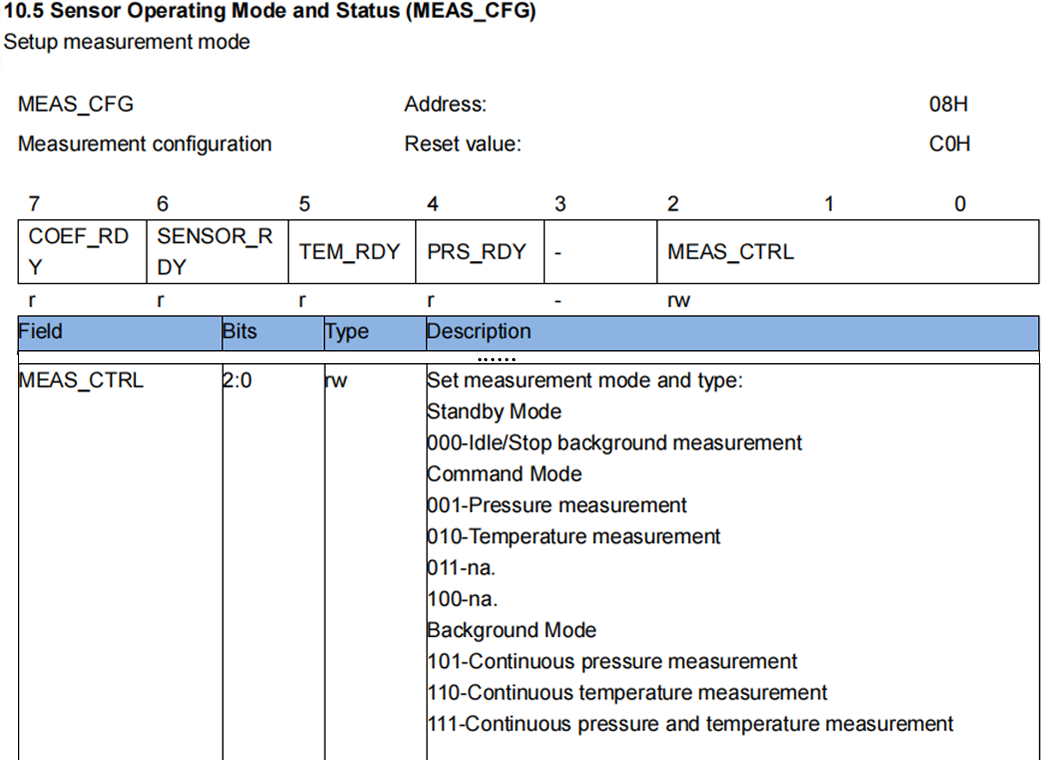 此外,6862i共支持Standby Mode、Command Mode和Background Mode三种工作模式,用户可通过高速IIC接口读写传感器操作模式与状态(MEAS_CFG)寄存器,来灵活配置传感器的运行模式与测量模式(连续压力/温度测量、连续压力和温度测量)。