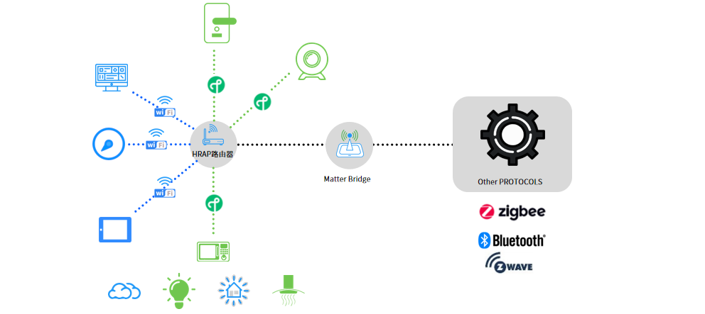 Matter协议基于IP架构,仅定义应用层标准,主要依赖支持IPv6的网络层和传输层进行数据传输。在此架构下,Matter底层网络可完美兼容Wi-Fi(高带宽)、Thread(低功耗网状网络)与以太网等IP协议,并可通过Matter Bridge桥接Zigbee、Z-WAVE与蓝牙等非IP协议。